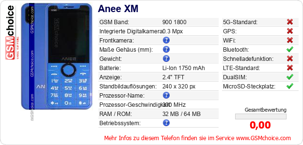 Hast du eigene Webseite? Willst du die Informationen über Standarddaten des Handys Anee XM irgendwo veröffentlichen? Das ist sehr einfach. Du kannst das Bild herunterladen oder kopieren und auf der Webseite folgenden Code hinzufügen:Das Einfügen von diesem Code verursacht das Anzeigen von dem folgenden Bild: