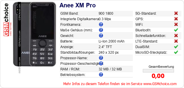 Hast du eigene Webseite? Willst du die Informationen über Standarddaten des Handys Anee XM Pro irgendwo veröffentlichen? Das ist sehr einfach. Du kannst das Bild herunterladen oder kopieren und auf der Webseite folgenden Code hinzufügen:Das Einfügen von diesem Code verursacht das Anzeigen von dem folgenden Bild: