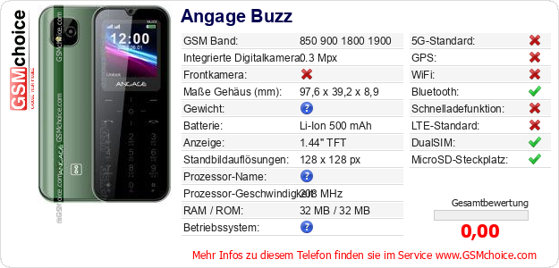 Hast du eigene Webseite? Willst du die Informationen über Standarddaten des Handys Angage Buzz irgendwo veröffentlichen? Das ist sehr einfach. Du kannst das Bild herunterladen oder kopieren und auf der Webseite folgenden Code hinzufügen:Das Einfügen von diesem Code verursacht das Anzeigen von dem folgenden Bild: