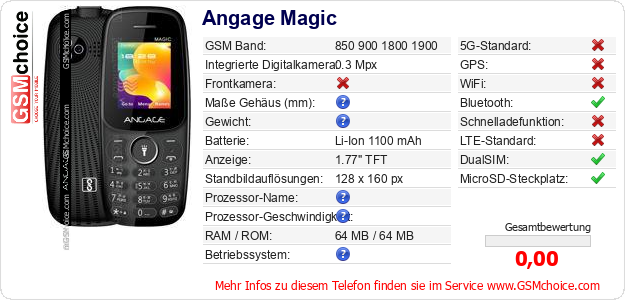 Hast du eigene Webseite? Willst du die Informationen über Standarddaten des Handys Angage Magic irgendwo veröffentlichen? Das ist sehr einfach. Du kannst das Bild herunterladen oder kopieren und auf der Webseite folgenden Code hinzufügen:Das Einfügen von diesem Code verursacht das Anzeigen von dem folgenden Bild: