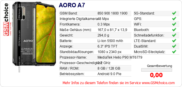 Hast du eigene Webseite? Willst du die Informationen über Standarddaten des Handys AORO A7 irgendwo veröffentlichen? Das ist sehr einfach. Du kannst das Bild herunterladen oder kopieren und auf der Webseite folgenden Code hinzufügen:Das Einfügen von diesem Code verursacht das Anzeigen von dem folgenden Bild: