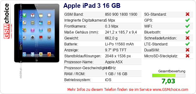 Hast du eigene Webseite? Willst du die Informationen über Standarddaten des Handys Apple iPad 3 16 GB irgendwo veröffentlichen? Das ist sehr einfach. Du kannst das Bild herunterladen oder kopieren und auf der Webseite folgenden Code hinzufügen:Das Einfügen von diesem Code verursacht das Anzeigen von dem folgenden Bild: