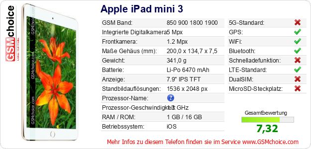 Hast du eigene Webseite? Willst du die Informationen über Standarddaten des Handys Apple iPad mini 3 irgendwo veröffentlichen? Das ist sehr einfach. Du kannst das Bild herunterladen oder kopieren und auf der Webseite folgenden Code hinzufügen:Das Einfügen von diesem Code verursacht das Anzeigen von dem folgenden Bild:
