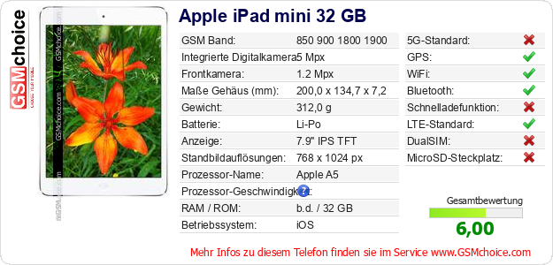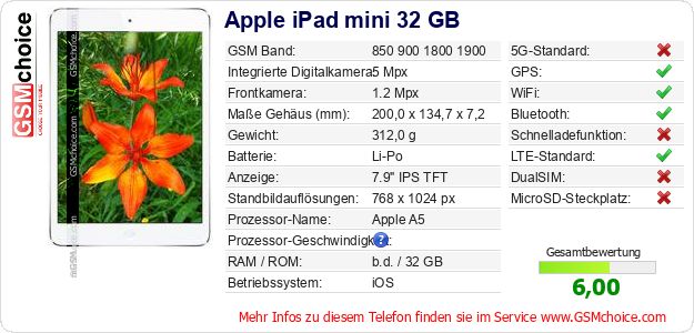 Hast du eigene Webseite? Willst du die Informationen über Standarddaten des Handys Apple iPad mini 32 GB irgendwo veröffentlichen? Das ist sehr einfach. Du kannst das Bild herunterladen oder kopieren und auf der Webseite folgenden Code hinzufügen:Das Einfügen von diesem Code verursacht das Anzeigen von dem folgenden Bild: