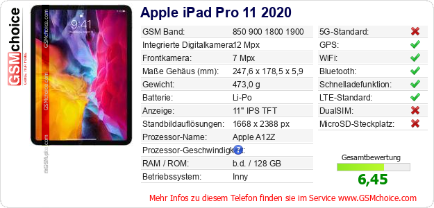 Hast du eigene Webseite? Willst du die Informationen über Standarddaten des Handys Apple iPad Pro 11 2020 irgendwo veröffentlichen? Das ist sehr einfach. Du kannst das Bild herunterladen oder kopieren und auf der Webseite folgenden Code hinzufügen:Das Einfügen von diesem Code verursacht das Anzeigen von dem folgenden Bild: