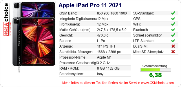 Hast du eigene Webseite? Willst du die Informationen über Standarddaten des Handys Apple iPad Pro 11 2021 irgendwo veröffentlichen? Das ist sehr einfach. Du kannst das Bild herunterladen oder kopieren und auf der Webseite folgenden Code hinzufügen:Das Einfügen von diesem Code verursacht das Anzeigen von dem folgenden Bild:
