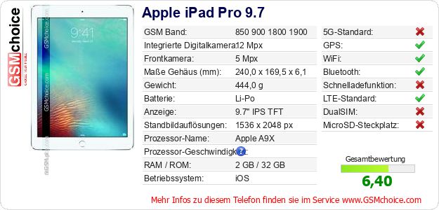Hast du eigene Webseite? Willst du die Informationen über Standarddaten des Handys Apple iPad Pro 9.7 irgendwo veröffentlichen? Das ist sehr einfach. Du kannst das Bild herunterladen oder kopieren und auf der Webseite folgenden Code hinzufügen:Das Einfügen von diesem Code verursacht das Anzeigen von dem folgenden Bild: