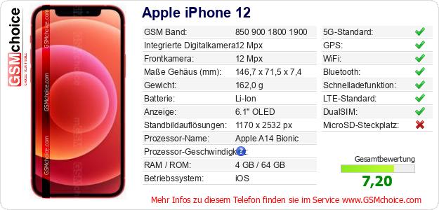 Hast du eigene Webseite? Willst du die Informationen über Standarddaten des Handys Apple iPhone 12 irgendwo veröffentlichen? Das ist sehr einfach. Du kannst das Bild herunterladen oder kopieren und auf der Webseite folgenden Code hinzufügen:Das Einfügen von diesem Code verursacht das Anzeigen von dem folgenden Bild: