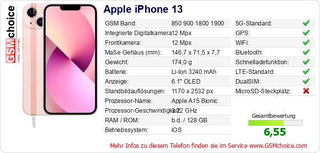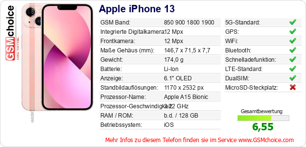 Hast du eigene Webseite? Willst du die Informationen über Standarddaten des Handys Apple iPhone 13 irgendwo veröffentlichen? Das ist sehr einfach. Du kannst das Bild herunterladen oder kopieren und auf der Webseite folgenden Code hinzufügen:Das Einfügen von diesem Code verursacht das Anzeigen von dem folgenden Bild: