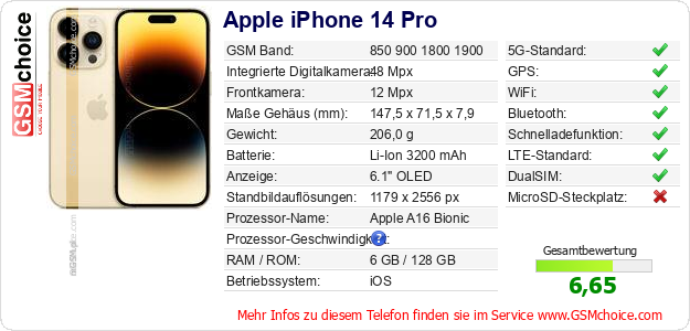 Hast du eigene Webseite? Willst du die Informationen über Standarddaten des Handys Apple iPhone 14 Pro irgendwo veröffentlichen? Das ist sehr einfach. Du kannst das Bild herunterladen oder kopieren und auf der Webseite folgenden Code hinzufügen:Das Einfügen von diesem Code verursacht das Anzeigen von dem folgenden Bild: