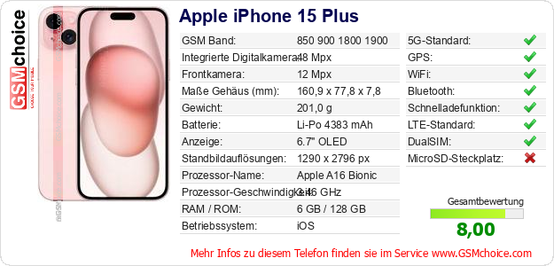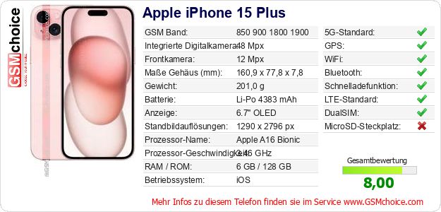 Hast du eigene Webseite? Willst du die Informationen über Standarddaten des Handys Apple iPhone 15 Plus irgendwo veröffentlichen? Das ist sehr einfach. Du kannst das Bild herunterladen oder kopieren und auf der Webseite folgenden Code hinzufügen:Das Einfügen von diesem Code verursacht das Anzeigen von dem folgenden Bild: