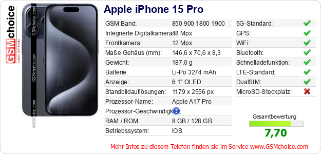 Hast du eigene Webseite? Willst du die Informationen über Standarddaten des Handys Apple iPhone 15 Pro irgendwo veröffentlichen? Das ist sehr einfach. Du kannst das Bild herunterladen oder kopieren und auf der Webseite folgenden Code hinzufügen:Das Einfügen von diesem Code verursacht das Anzeigen von dem folgenden Bild: