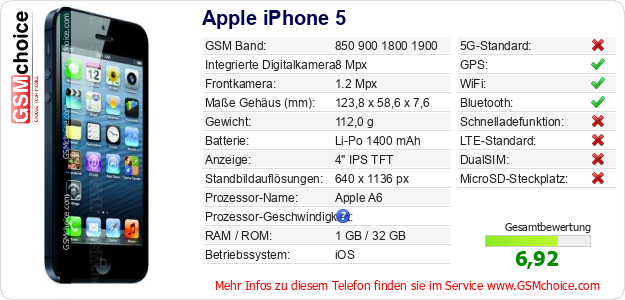 Hast du eigene Webseite? Willst du die Informationen über Standarddaten des Handys Apple iPhone 5 irgendwo veröffentlichen? Das ist sehr einfach. Du kannst das Bild herunterladen oder kopieren und auf der Webseite folgenden Code hinzufügen:Das Einfügen von diesem Code verursacht das Anzeigen von dem folgenden Bild: