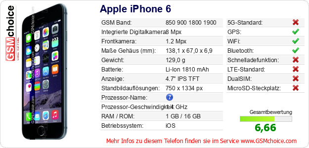 Hast du eigene Webseite? Willst du die Informationen über Standarddaten des Handys Apple iPhone 6 irgendwo veröffentlichen? Das ist sehr einfach. Du kannst das Bild herunterladen oder kopieren und auf der Webseite folgenden Code hinzufügen:Das Einfügen von diesem Code verursacht das Anzeigen von dem folgenden Bild: