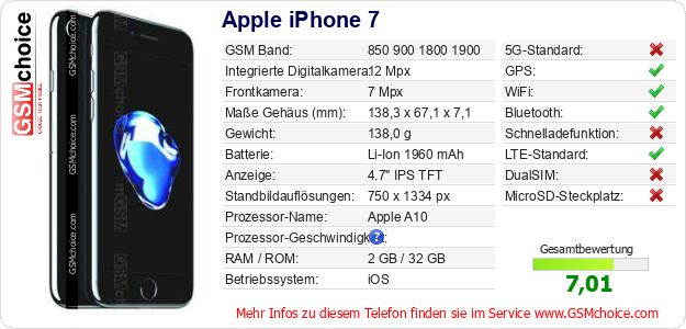 Hast du eigene Webseite? Willst du die Informationen über Standarddaten des Handys Apple iPhone 7 irgendwo veröffentlichen? Das ist sehr einfach. Du kannst das Bild herunterladen oder kopieren und auf der Webseite folgenden Code hinzufügen:Das Einfügen von diesem Code verursacht das Anzeigen von dem folgenden Bild: