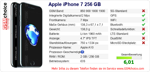 Hast du eigene Webseite? Willst du die Informationen über Standarddaten des Handys Apple iPhone 7 256 GB irgendwo veröffentlichen? Das ist sehr einfach. Du kannst das Bild herunterladen oder kopieren und auf der Webseite folgenden Code hinzufügen:Das Einfügen von diesem Code verursacht das Anzeigen von dem folgenden Bild: