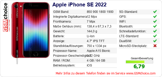 Hast du eigene Webseite? Willst du die Informationen über Standarddaten des Handys Apple iPhone SE 2022 irgendwo veröffentlichen? Das ist sehr einfach. Du kannst das Bild herunterladen oder kopieren und auf der Webseite folgenden Code hinzufügen:Das Einfügen von diesem Code verursacht das Anzeigen von dem folgenden Bild: