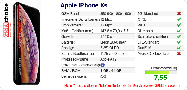 Hast du eigene Webseite? Willst du die Informationen über Standarddaten des Handys Apple iPhone Xs irgendwo veröffentlichen? Das ist sehr einfach. Du kannst das Bild herunterladen oder kopieren und auf der Webseite folgenden Code hinzufügen:Das Einfügen von diesem Code verursacht das Anzeigen von dem folgenden Bild: