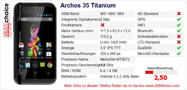 Hast du eigene Webseite? Willst du die Informationen über Standarddaten des Handys Archos 35 Titanium irgendwo veröffentlichen? Das ist sehr einfach. Du kannst das Bild herunterladen oder kopieren und auf der Webseite folgenden Code hinzufügen:Das Einfügen von diesem Code verursacht das Anzeigen von dem folgenden Bild: