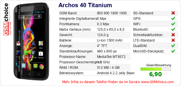 Hast du eigene Webseite? Willst du die Informationen über Standarddaten des Handys Archos 40 Titanium irgendwo veröffentlichen? Das ist sehr einfach. Du kannst das Bild herunterladen oder kopieren und auf der Webseite folgenden Code hinzufügen:Das Einfügen von diesem Code verursacht das Anzeigen von dem folgenden Bild: