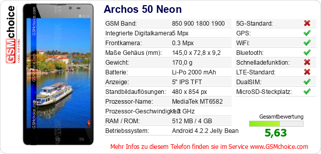 Daten des Mobiltelefons Archos 50 Neon auf Ihrer Seite