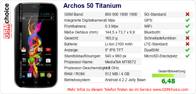 Hast du eigene Webseite? Willst du die Informationen über Standarddaten des Handys Archos 50 Titanium irgendwo veröffentlichen? Das ist sehr einfach. Du kannst das Bild herunterladen oder kopieren und auf der Webseite folgenden Code hinzufügen:Das Einfügen von diesem Code verursacht das Anzeigen von dem folgenden Bild: