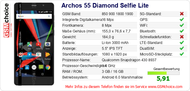 Hast du eigene Webseite? Willst du die Informationen über Standarddaten des Handys Archos 55 Diamond Selfie Lite irgendwo veröffentlichen? Das ist sehr einfach. Du kannst das Bild herunterladen oder kopieren und auf der Webseite folgenden Code hinzufügen:Das Einfügen von diesem Code verursacht das Anzeigen von dem folgenden Bild: