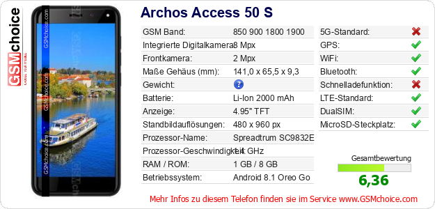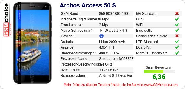 Hast du eigene Webseite? Willst du die Informationen über Standarddaten des Handys Archos Access 50 S irgendwo veröffentlichen? Das ist sehr einfach. Du kannst das Bild herunterladen oder kopieren und auf der Webseite folgenden Code hinzufügen:Das Einfügen von diesem Code verursacht das Anzeigen von dem folgenden Bild: