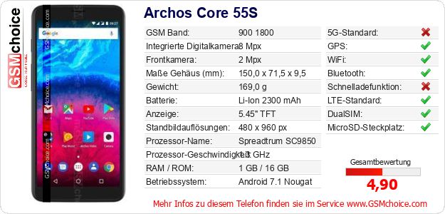 Hast du eigene Webseite? Willst du die Informationen über Standarddaten des Handys Archos Core 55S irgendwo veröffentlichen? Das ist sehr einfach. Du kannst das Bild herunterladen oder kopieren und auf der Webseite folgenden Code hinzufügen:Das Einfügen von diesem Code verursacht das Anzeigen von dem folgenden Bild:
