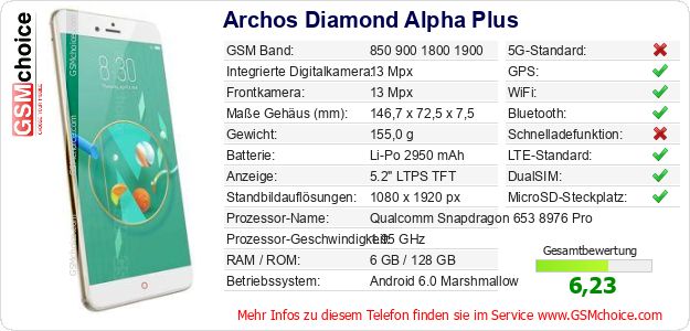Hast du eigene Webseite? Willst du die Informationen über Standarddaten des Handys Archos Diamond Alpha Plus irgendwo veröffentlichen? Das ist sehr einfach. Du kannst das Bild herunterladen oder kopieren und auf der Webseite folgenden Code hinzufügen:Das Einfügen von diesem Code verursacht das Anzeigen von dem folgenden Bild: