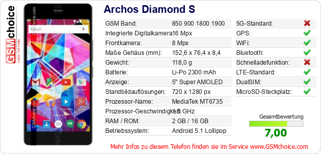 Hast du eigene Webseite? Willst du die Informationen über Standarddaten des Handys Archos Diamond S irgendwo veröffentlichen? Das ist sehr einfach. Du kannst das Bild herunterladen oder kopieren und auf der Webseite folgenden Code hinzufügen:Das Einfügen von diesem Code verursacht das Anzeigen von dem folgenden Bild: