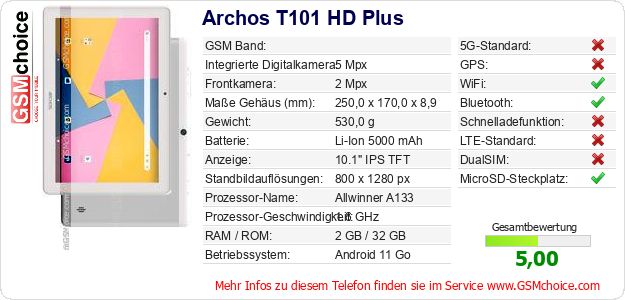 Hast du eigene Webseite? Willst du die Informationen über Standarddaten des Handys Archos T101 HD Plus irgendwo veröffentlichen? Das ist sehr einfach. Du kannst das Bild herunterladen oder kopieren und auf der Webseite folgenden Code hinzufügen:Das Einfügen von diesem Code verursacht das Anzeigen von dem folgenden Bild: