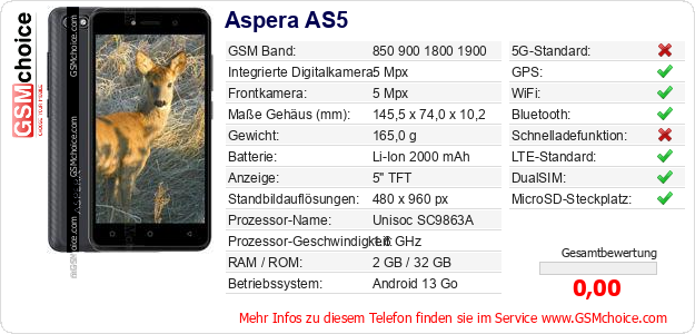 Hast du eigene Webseite? Willst du die Informationen über Standarddaten des Handys Aspera AS5 irgendwo veröffentlichen? Das ist sehr einfach. Du kannst das Bild herunterladen oder kopieren und auf der Webseite folgenden Code hinzufügen:Das Einfügen von diesem Code verursacht das Anzeigen von dem folgenden Bild: