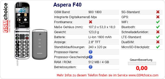 Hast du eigene Webseite? Willst du die Informationen über Standarddaten des Handys Aspera F40 irgendwo veröffentlichen? Das ist sehr einfach. Du kannst das Bild herunterladen oder kopieren und auf der Webseite folgenden Code hinzufügen:Das Einfügen von diesem Code verursacht das Anzeigen von dem folgenden Bild: