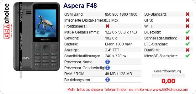 Hast du eigene Webseite? Willst du die Informationen über Standarddaten des Handys Aspera F48 irgendwo veröffentlichen? Das ist sehr einfach. Du kannst das Bild herunterladen oder kopieren und auf der Webseite folgenden Code hinzufügen:Das Einfügen von diesem Code verursacht das Anzeigen von dem folgenden Bild: