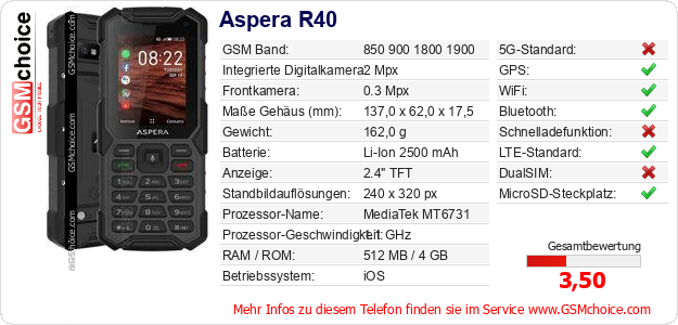 Hast du eigene Webseite? Willst du die Informationen über Standarddaten des Handys Aspera R40 irgendwo veröffentlichen? Das ist sehr einfach. Du kannst das Bild herunterladen oder kopieren und auf der Webseite folgenden Code hinzufügen:Das Einfügen von diesem Code verursacht das Anzeigen von dem folgenden Bild: