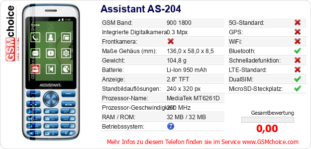 Hast du eigene Webseite? Willst du die Informationen über Standarddaten des Handys Assistant AS-204 irgendwo veröffentlichen? Das ist sehr einfach. Du kannst das Bild herunterladen oder kopieren und auf der Webseite folgenden Code hinzufügen:Das Einfügen von diesem Code verursacht das Anzeigen von dem folgenden Bild: