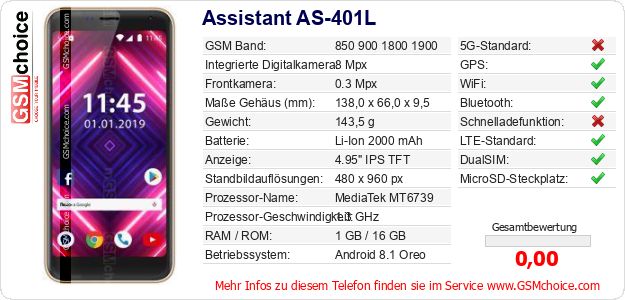 Hast du eigene Webseite? Willst du die Informationen über Standarddaten des Handys Assistant AS-401L irgendwo veröffentlichen? Das ist sehr einfach. Du kannst das Bild herunterladen oder kopieren und auf der Webseite folgenden Code hinzufügen:Das Einfügen von diesem Code verursacht das Anzeigen von dem folgenden Bild: