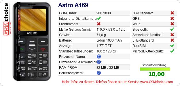 Hast du eigene Webseite? Willst du die Informationen über Standarddaten des Handys Astro A169 irgendwo veröffentlichen? Das ist sehr einfach. Du kannst das Bild herunterladen oder kopieren und auf der Webseite folgenden Code hinzufügen:Das Einfügen von diesem Code verursacht das Anzeigen von dem folgenden Bild: