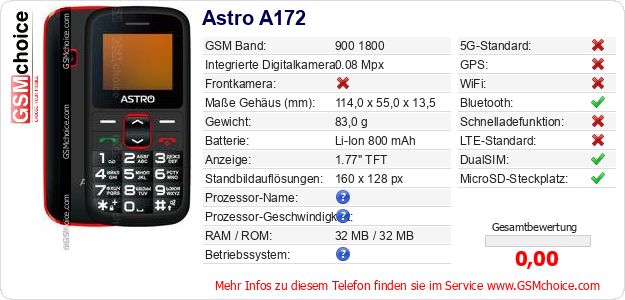 Hast du eigene Webseite? Willst du die Informationen über Standarddaten des Handys Astro A172 irgendwo veröffentlichen? Das ist sehr einfach. Du kannst das Bild herunterladen oder kopieren und auf der Webseite folgenden Code hinzufügen:Das Einfügen von diesem Code verursacht das Anzeigen von dem folgenden Bild: