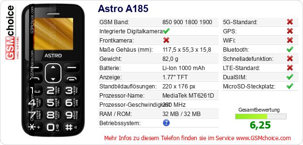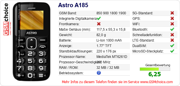 Hast du eigene Webseite? Willst du die Informationen über Standarddaten des Handys Astro A185 irgendwo veröffentlichen? Das ist sehr einfach. Du kannst das Bild herunterladen oder kopieren und auf der Webseite folgenden Code hinzufügen:Das Einfügen von diesem Code verursacht das Anzeigen von dem folgenden Bild: