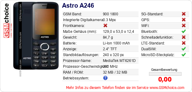 Hast du eigene Webseite? Willst du die Informationen über Standarddaten des Handys Astro A246 irgendwo veröffentlichen? Das ist sehr einfach. Du kannst das Bild herunterladen oder kopieren und auf der Webseite folgenden Code hinzufügen:Das Einfügen von diesem Code verursacht das Anzeigen von dem folgenden Bild: