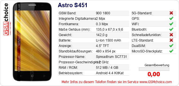 Hast du eigene Webseite? Willst du die Informationen über Standarddaten des Handys Astro S451 irgendwo veröffentlichen? Das ist sehr einfach. Du kannst das Bild herunterladen oder kopieren und auf der Webseite folgenden Code hinzufügen:Das Einfügen von diesem Code verursacht das Anzeigen von dem folgenden Bild: