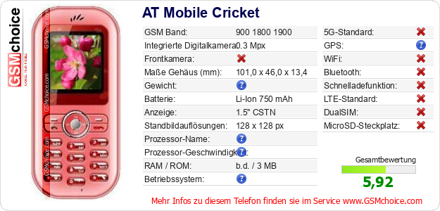 Hast du eigene Webseite? Willst du die Informationen über Standarddaten des Handys AT Mobile Cricket irgendwo veröffentlichen? Das ist sehr einfach. Du kannst das Bild herunterladen oder kopieren und auf der Webseite folgenden Code hinzufügen:Das Einfügen von diesem Code verursacht das Anzeigen von dem folgenden Bild: