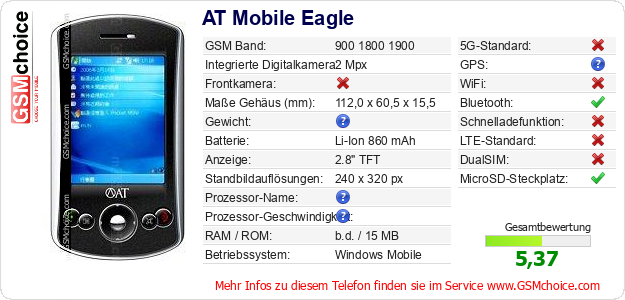 Hast du eigene Webseite? Willst du die Informationen über Standarddaten des Handys AT Mobile Eagle irgendwo veröffentlichen? Das ist sehr einfach. Du kannst das Bild herunterladen oder kopieren und auf der Webseite folgenden Code hinzufügen:Das Einfügen von diesem Code verursacht das Anzeigen von dem folgenden Bild: