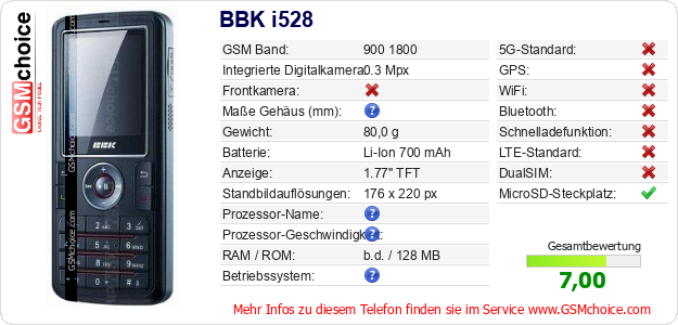 Hast du eigene Webseite? Willst du die Informationen über Standarddaten des Handys BBK i528 irgendwo veröffentlichen? Das ist sehr einfach. Du kannst das Bild herunterladen oder kopieren und auf der Webseite folgenden Code hinzufügen:Das Einfügen von diesem Code verursacht das Anzeigen von dem folgenden Bild: