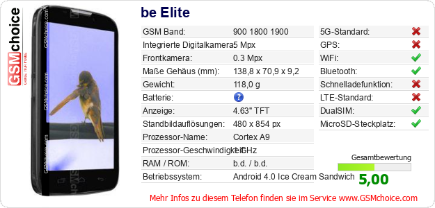 Hast du eigene Webseite? Willst du die Informationen über Standarddaten des Handys be Elite irgendwo veröffentlichen? Das ist sehr einfach. Du kannst das Bild herunterladen oder kopieren und auf der Webseite folgenden Code hinzufügen:Das Einfügen von diesem Code verursacht das Anzeigen von dem folgenden Bild: