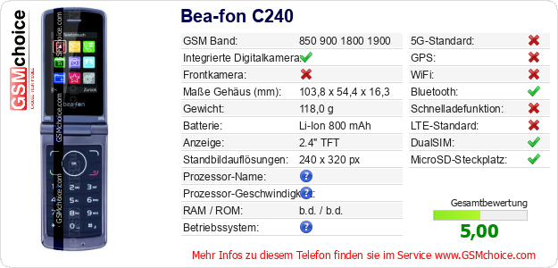 Hast du eigene Webseite? Willst du die Informationen über Standarddaten des Handys Bea-fon C240 irgendwo veröffentlichen? Das ist sehr einfach. Du kannst das Bild herunterladen oder kopieren und auf der Webseite folgenden Code hinzufügen:Das Einfügen von diesem Code verursacht das Anzeigen von dem folgenden Bild: