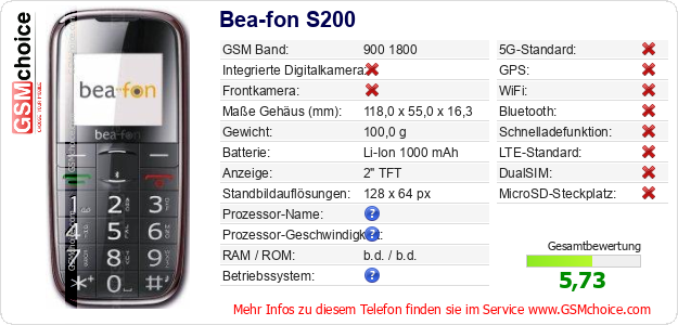 Hast du eigene Webseite? Willst du die Informationen über Standarddaten des Handys Bea-fon S200 irgendwo veröffentlichen? Das ist sehr einfach. Du kannst das Bild herunterladen oder kopieren und auf der Webseite folgenden Code hinzufügen:Das Einfügen von diesem Code verursacht das Anzeigen von dem folgenden Bild: