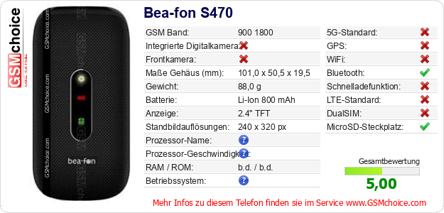 Hast du eigene Webseite? Willst du die Informationen über Standarddaten des Handys Bea-fon S470 irgendwo veröffentlichen? Das ist sehr einfach. Du kannst das Bild herunterladen oder kopieren und auf der Webseite folgenden Code hinzufügen:Das Einfügen von diesem Code verursacht das Anzeigen von dem folgenden Bild: